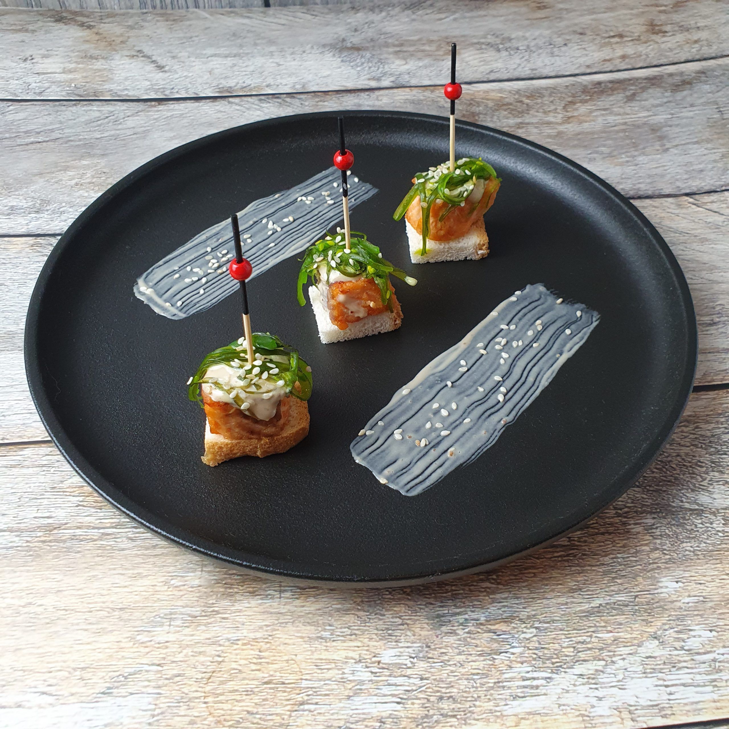 - Канапе Лосось-Татаки с салатом Чука и ореховым соусом