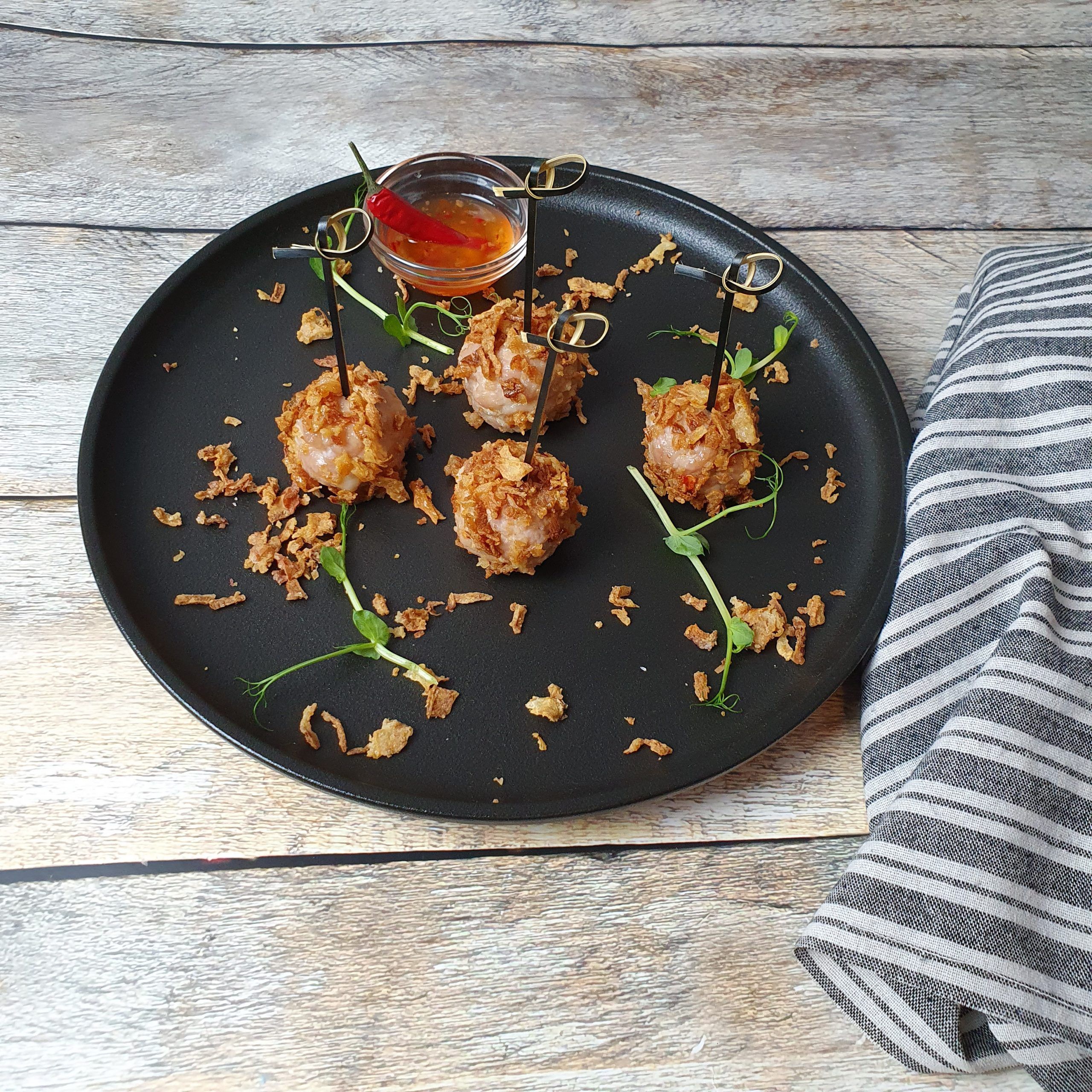 - Канапе мясное роше со сладким соусом Чили и луком-фри