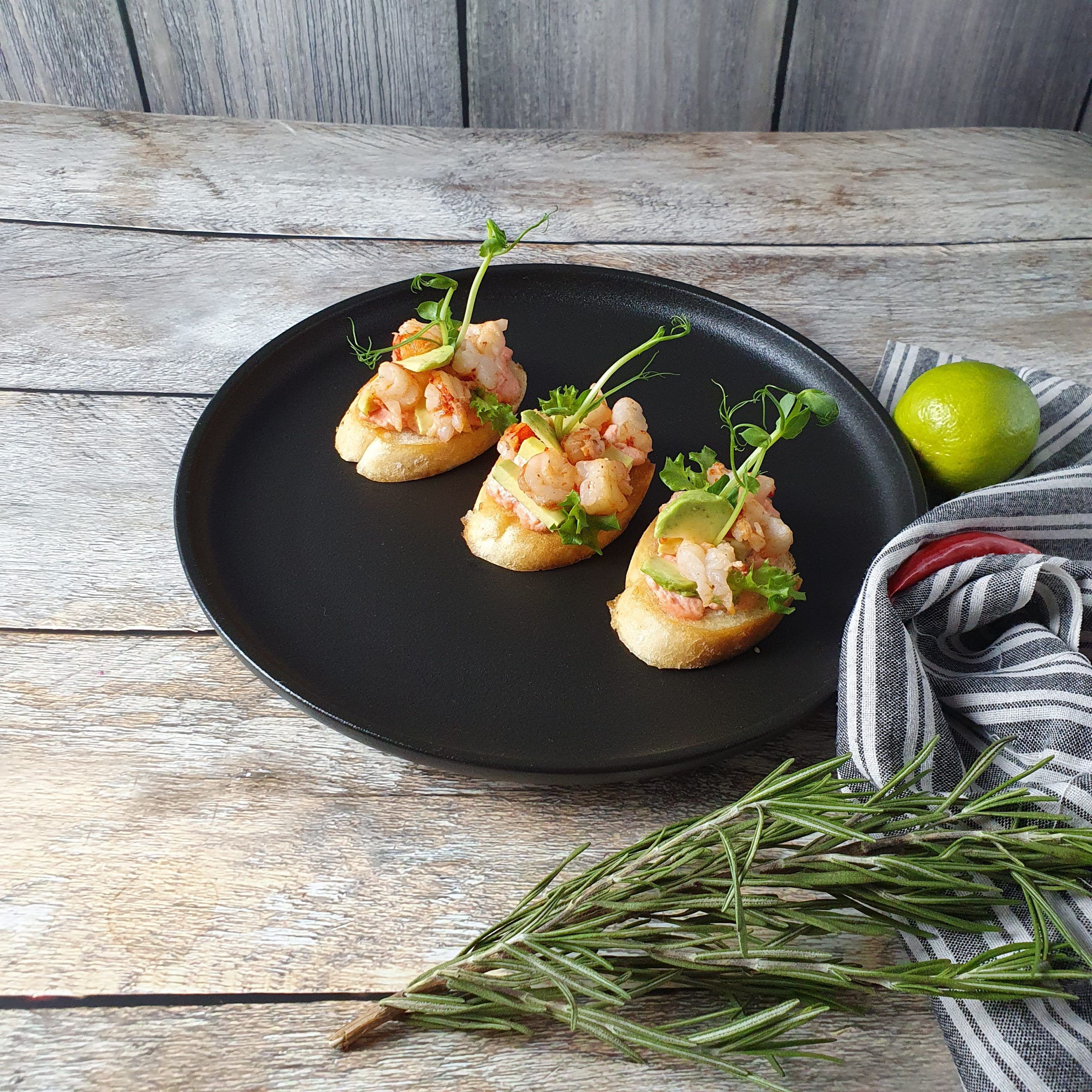 - Брускетта с гуакамоле, креветкой и микро-зеленью
