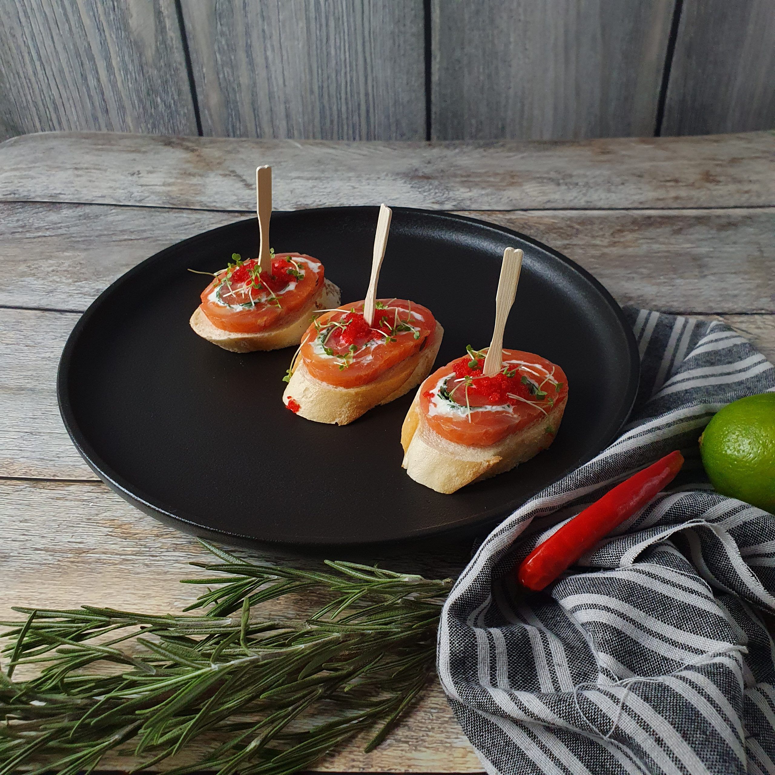 - Брускетта с сёмгой слабой соли, салатом чука и икрой Тобико