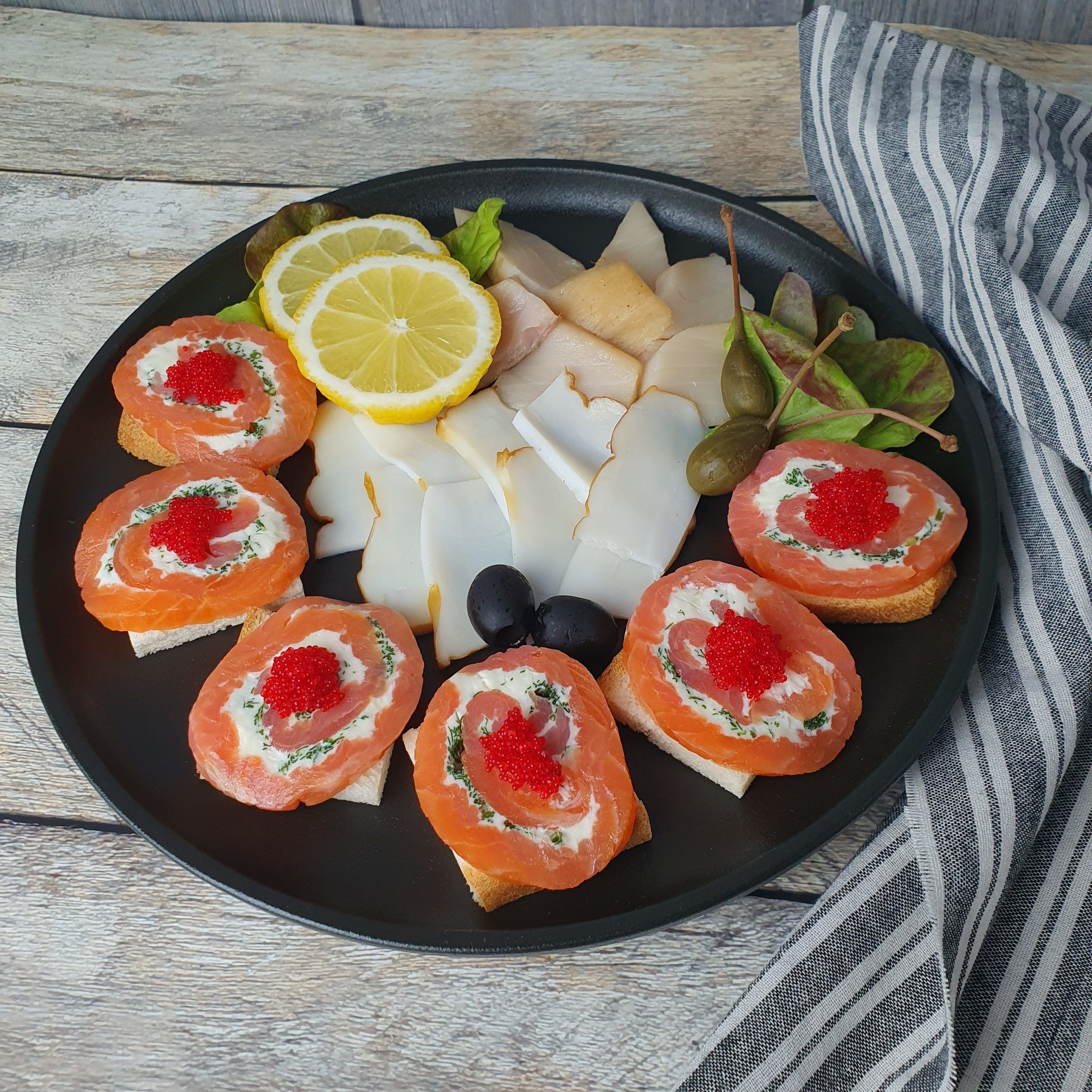 - Канапе с Семгой слабой соли, сыром Филадельфия и Тобико